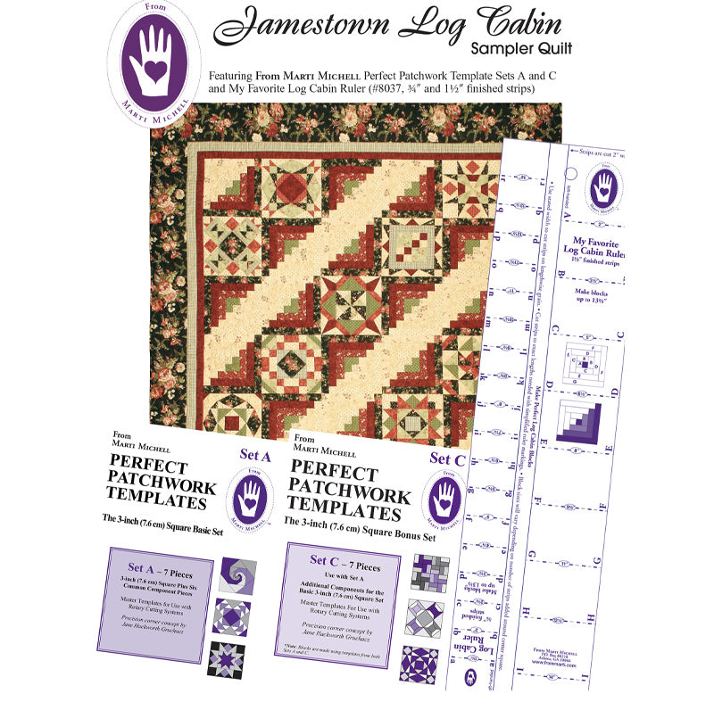 The Jamestown pattern includes step-by-steps for 12 sampler blocks made with Sets A and C, Log Cabin blocks made with the Log Cabin Ruler, and finishing instructions.